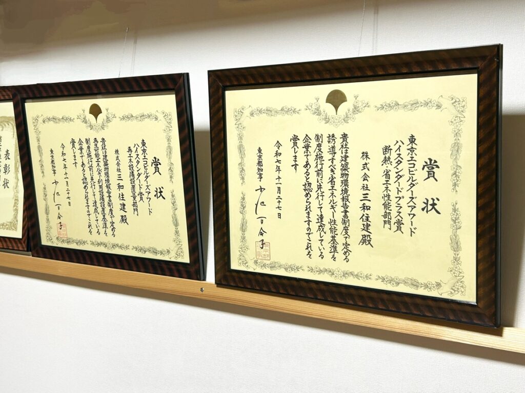 また、ハイスタンダード賞よりさらに高いレベルを達成した建築物・事業者に贈られ「ハイスタンダードプラス賞」もあり、SANWAHAUSは ハイスタンダードプラス賞の断熱・省エネ性能と再エネ設備設置量でも賞をいただくことができました。